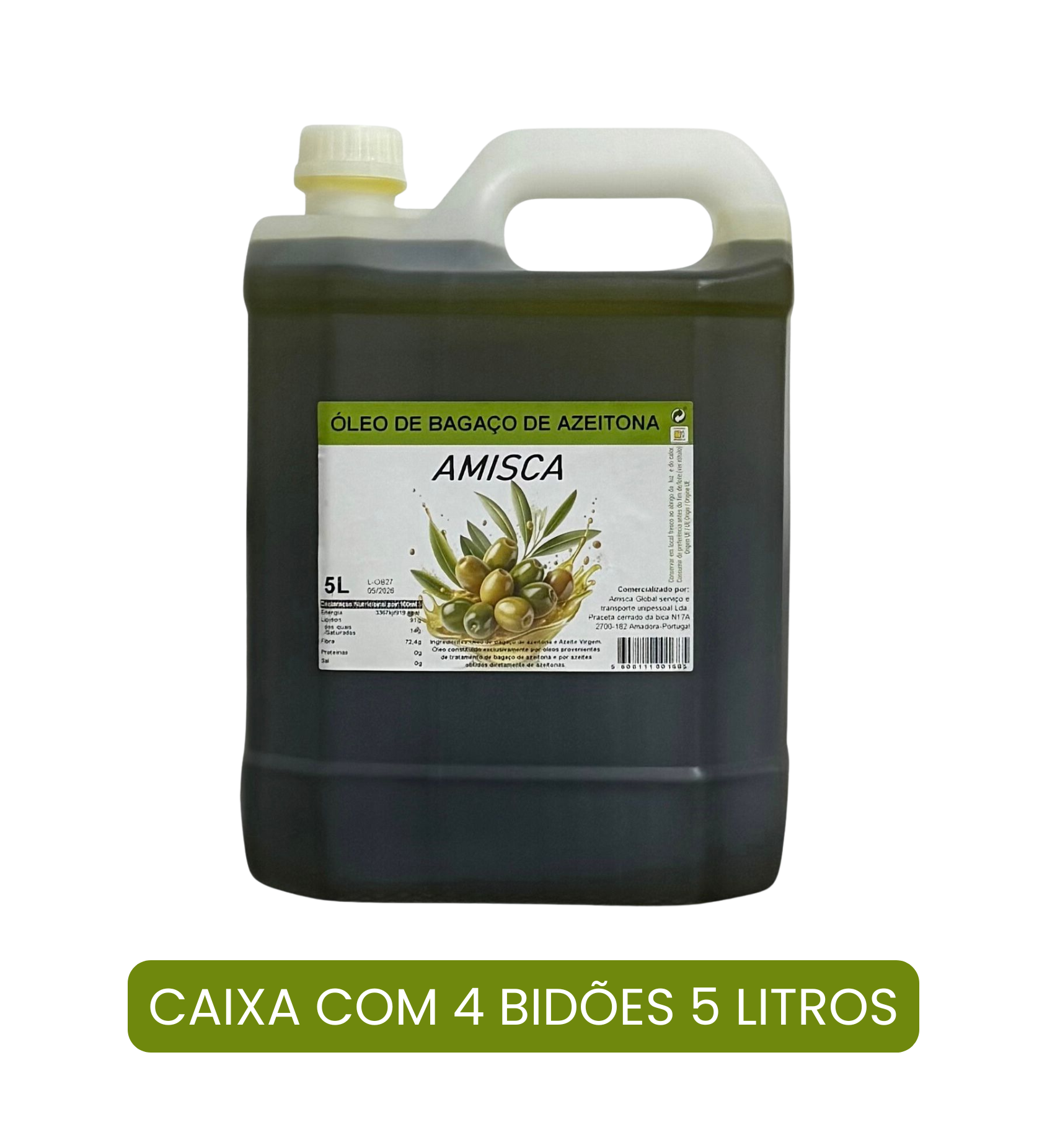 Conjunto com 4 bidões de 5L de óleo refinado, ideal para frituras e uso industrial. Produzido com aproveitamento do bagaço da azeitona.